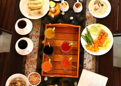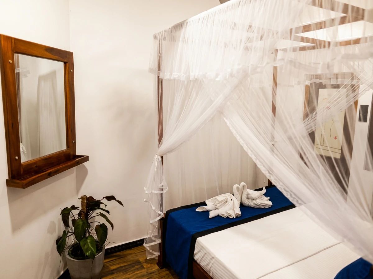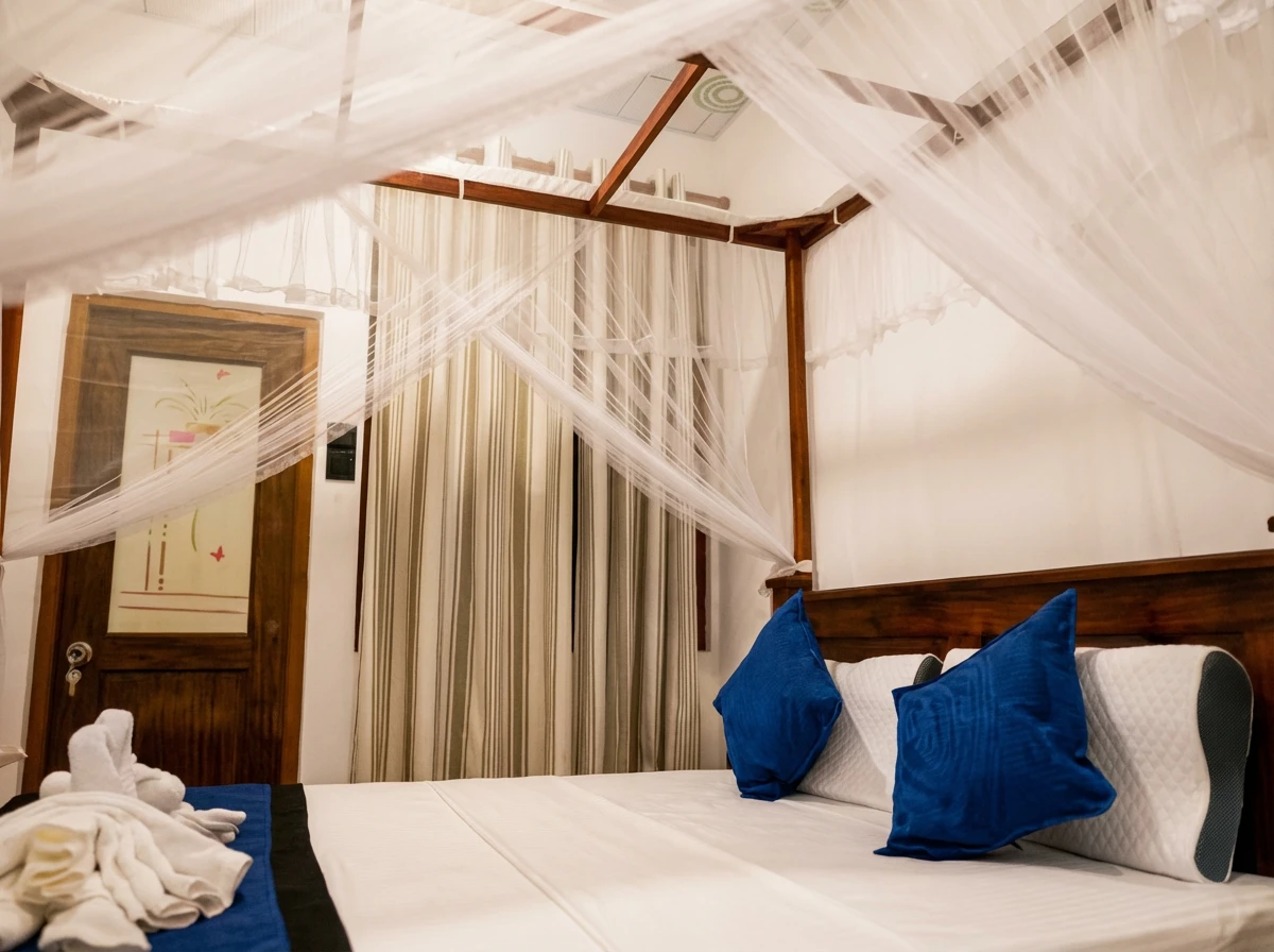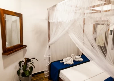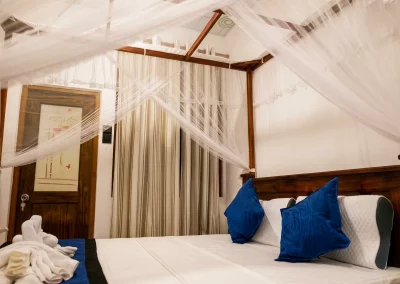 Refuge intime pour âmes voyageuses, la chambre Globe-trotter offre 9 m² de douceur tropicale. Sous la moustiquaire légère du lit à baldaquin, un confort moelleux invite au repos après l’aventure.