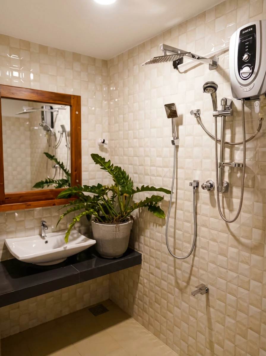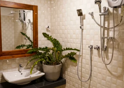 Le bois naturel apaise l’espace, tandis que le ventilateur rafraichira l’atmosphère. Salle de bain privative avec douche pluie et eau chaude. Un petit havre authentique où l’on se laisse porter par le rythme simple et apaisant du séjour.