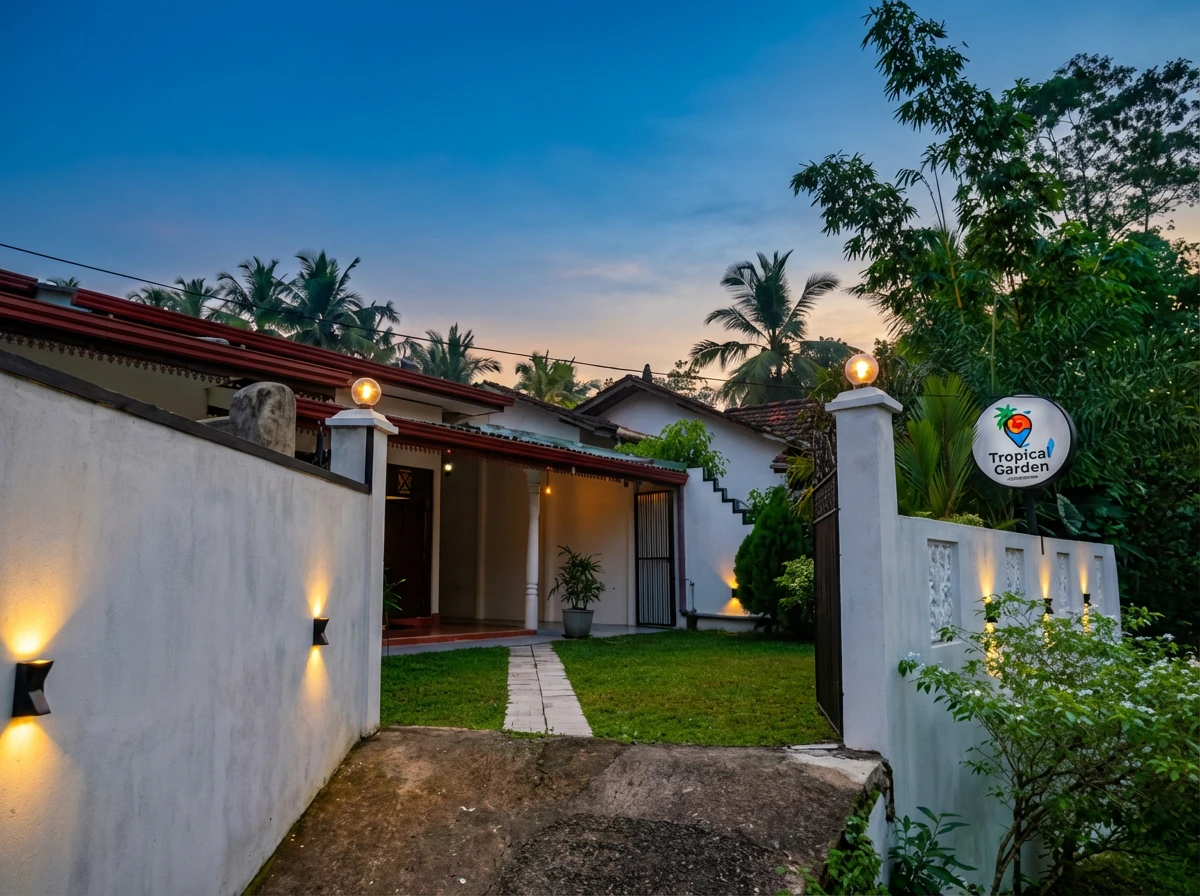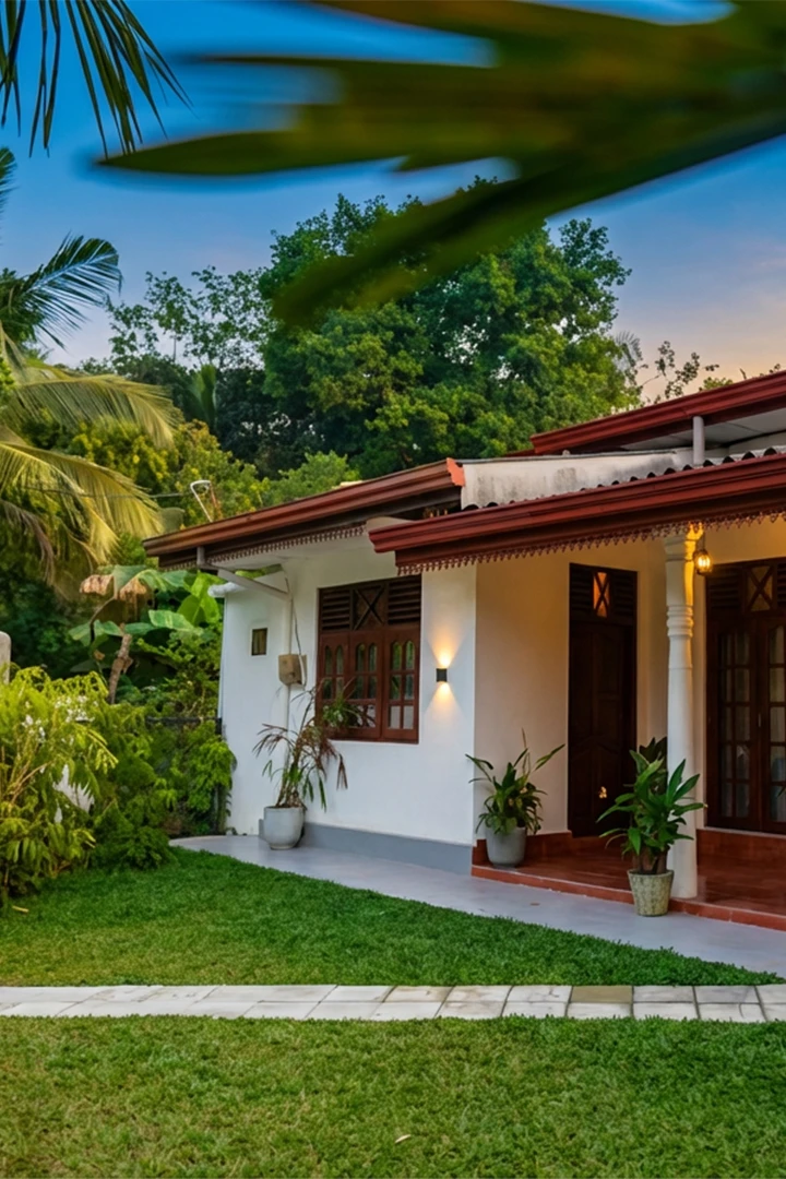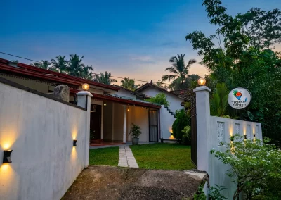 La chambre Globe-trotter offre un espace chaleureux avec lit à baldaquin, moustiquaire, ventilateur de plafond et salle de bain privée. Elle est indépendante tout en faisant partie de la villa Tropical Garden, avec accès libre aux espaces communs : cuisine équipée, séjour, salle à manger et jardin.