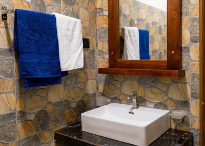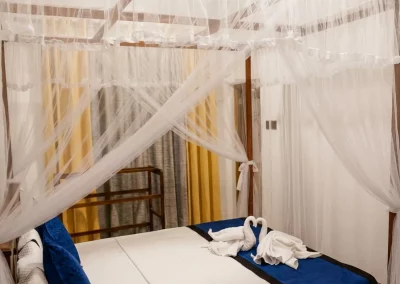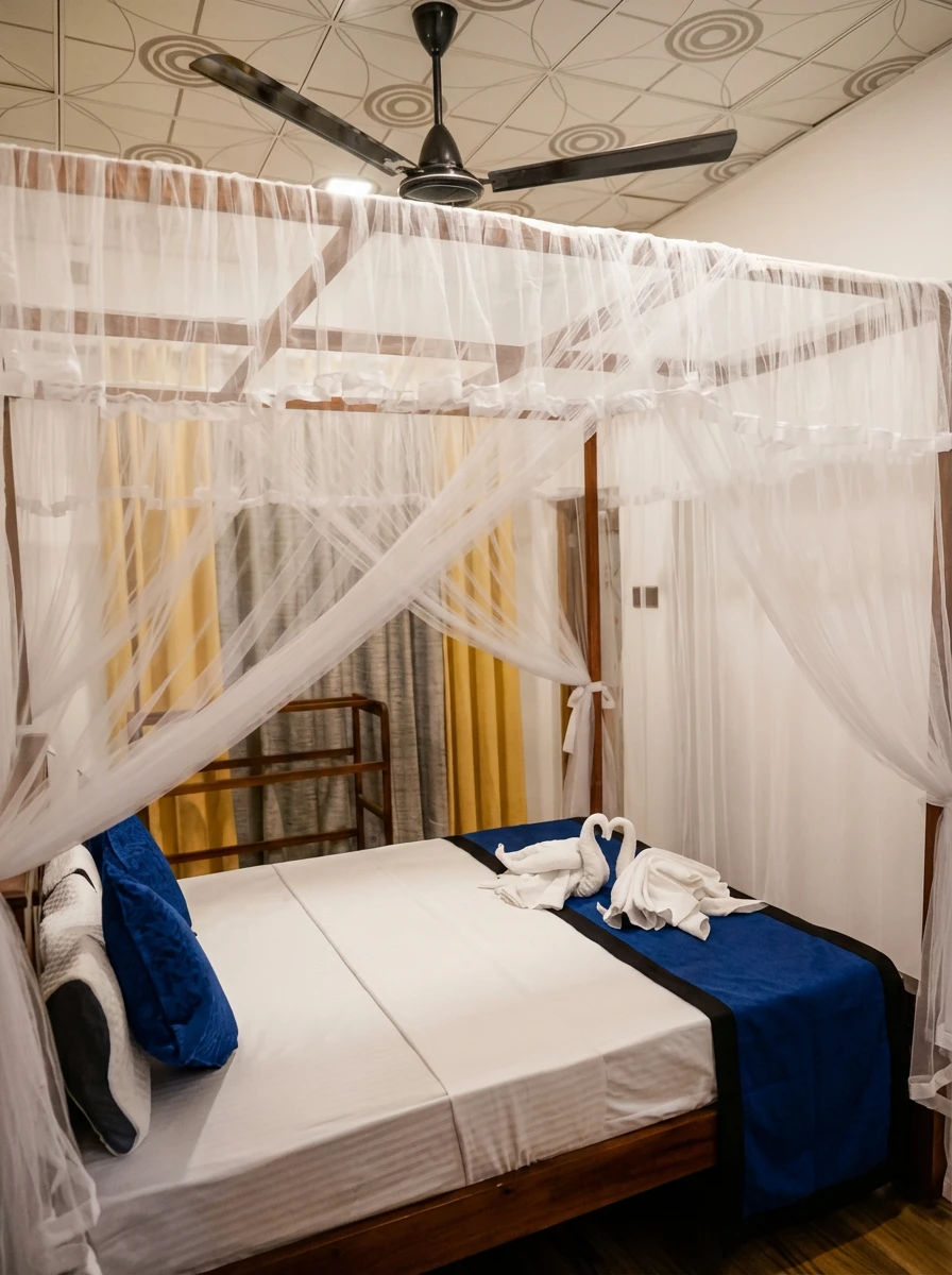 Dans la chambre La Plume, tout crée un vrai petit nid de douceur : lit à baldaquin, moustiquaire légère, literie haut de gamme et ventilateur de plafond, complétés par la climatisation. Salle de bain privée et fonctionnelle avec eau chaude. Un petit espace charmant, confortable et apaisant, idéal pour un séjour simple et serein, à 2,5 km de la plage.