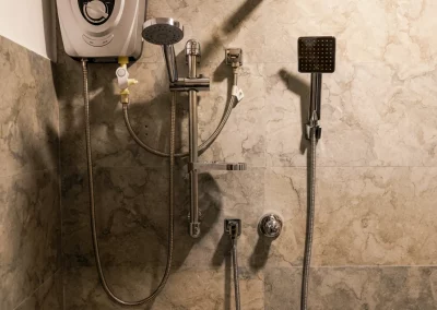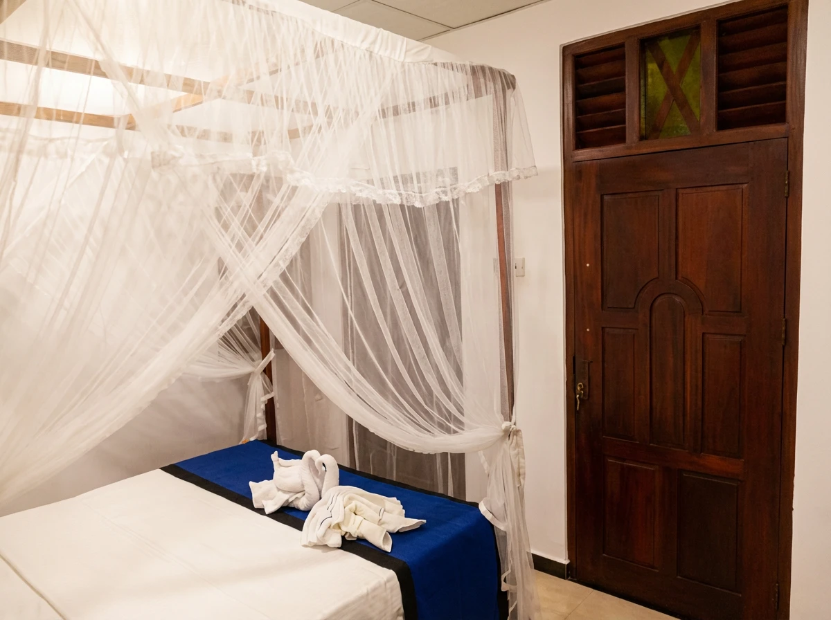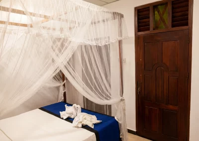 Dans les 11 m² de la chambre Douce Aurore, tout invite au calme et à la détente : lit à baldaquin, moustiquaire légère et literie haut de gamme pour des nuits sereines. Ventilateur de plafond ou climatisation selon votre confort. Salle de bain moderne avec eau chaude et décor minéral. Un cocon intime, proche des commodités et à 2,5 km de la plage.